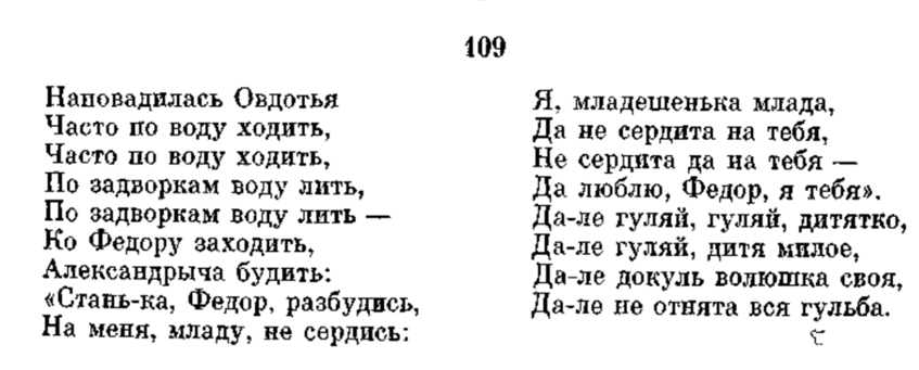 Анне Васильевне Осташовой не давали нам покоя. От нее (и в сольном, и в хоровом исполнении) ленинградцами было записано 17 песен, больше (в рочевской группе) – только от Марфы Тороповой. По предположению некоторых рочевцев, Анна Васильевна – это жена пижемца Константина Еремеевича Осташова, в то время – учителя в Рочево, через какое-то время уехавшего с семьей из деревни. Пристрастный взгляд на репертуар А. В. Осташовой подтвердил ее принадлежность пижемской традиции. Более половины песен в записях от А. В. Осташовой спеты ею соло, поскольку они практически не были известны на Цильме (например, «Девка плакала она тужила по голубчике по своём...», «Не со вечера душечка, со двора милой съезжает...») или вообще характерны